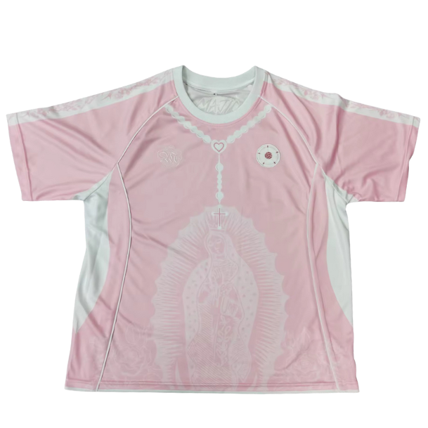 Nuestra Senora Jersey in Pink features a relaxed fit, crafted from 90% polyester and 10% spandex for comfort and flexibility. It showcases detailed embroidery alongside a rubber-pressed design.